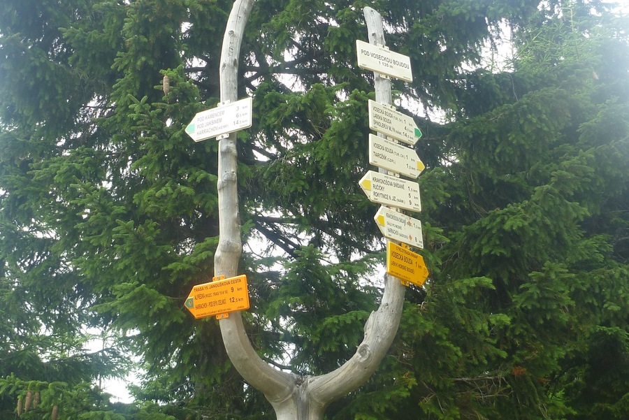 V levo Szrenica, v pravo Vosecká bouda |  Bystřina |  Rozcestník pod Voseckou boudou |